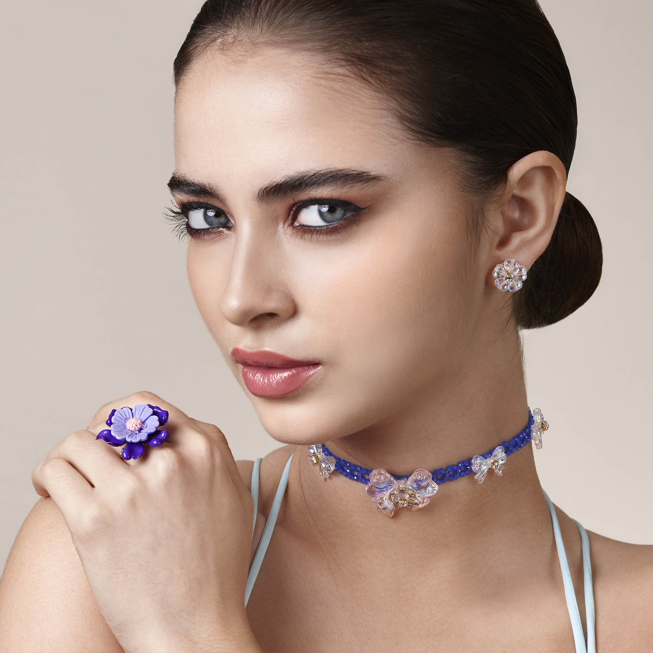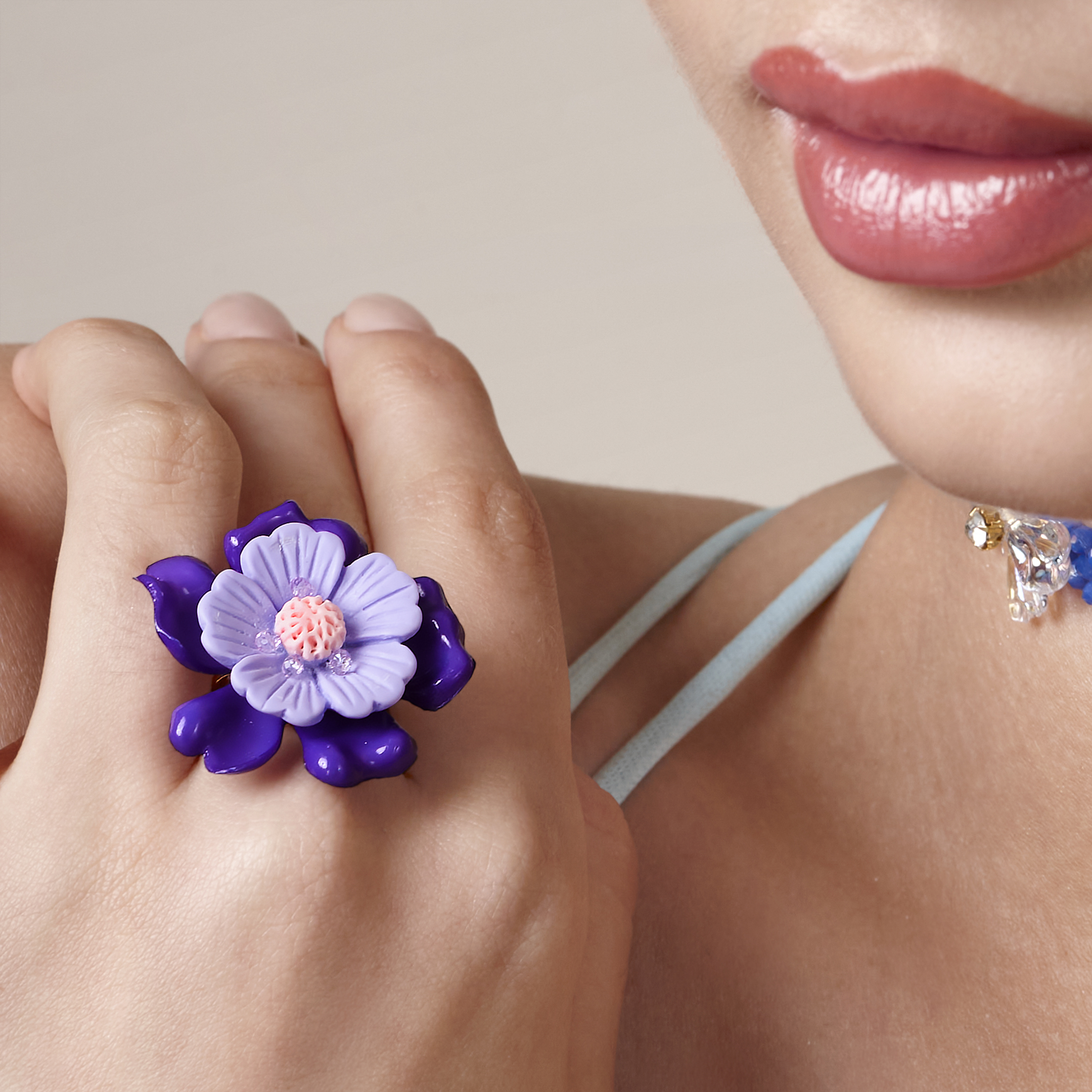 IAnillo de flor de resina, cristales bordados en base de metal enchapado en oro.