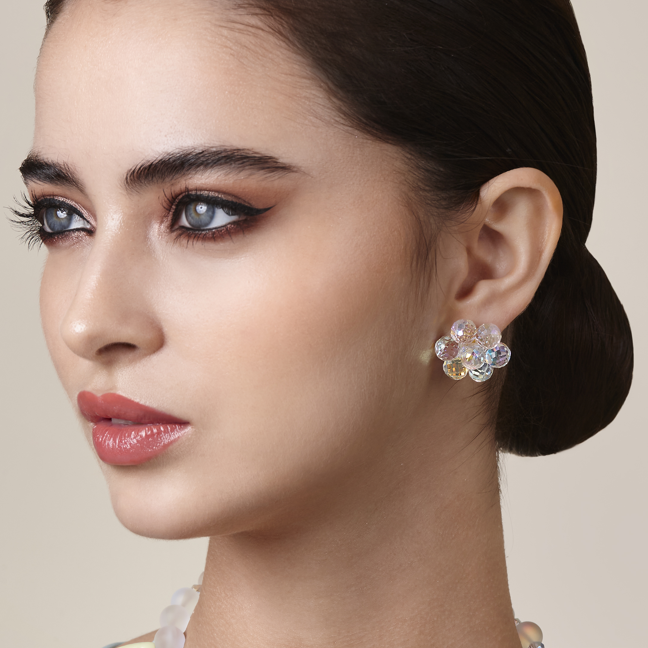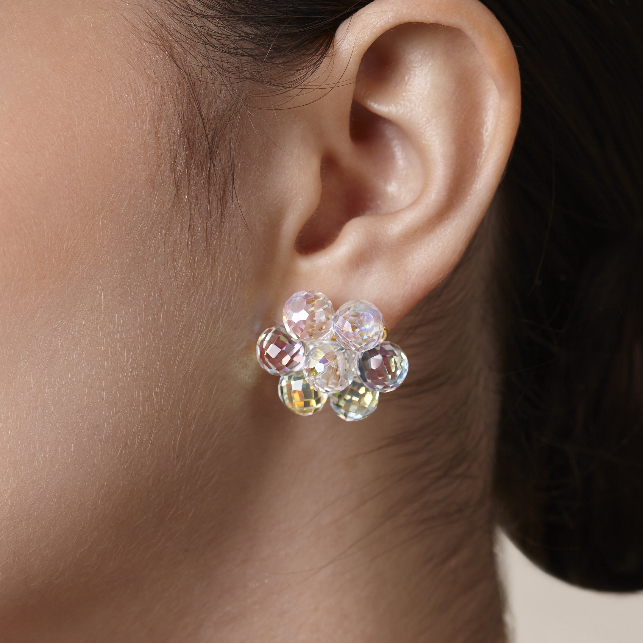 Aretes de flores bordados a mano con cuentas de cristal facetado en tono transparente tornasol, bordado en base de filigrana enchapada en oro.