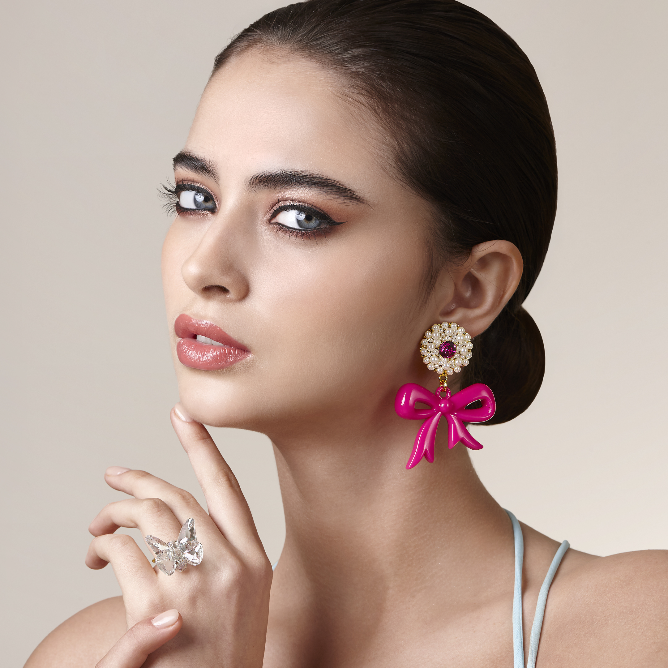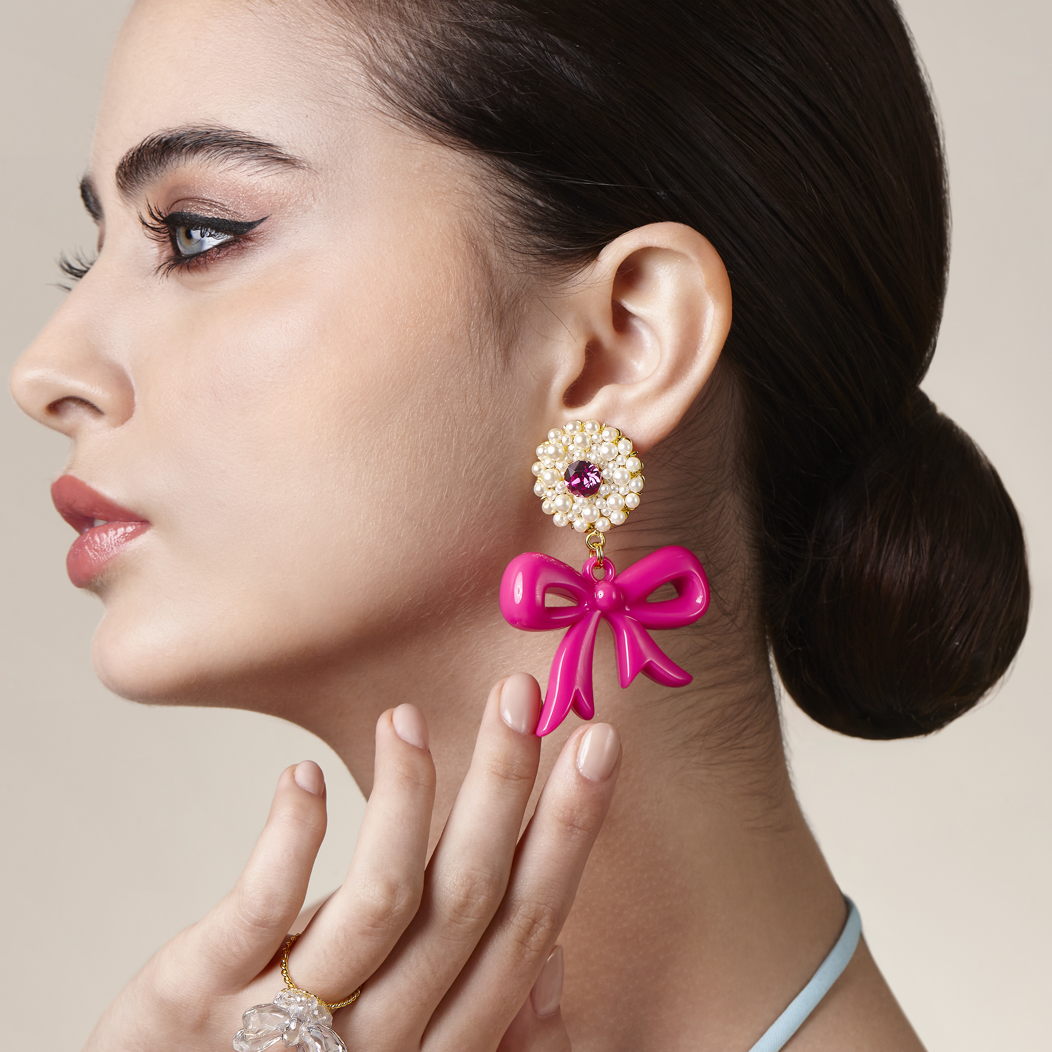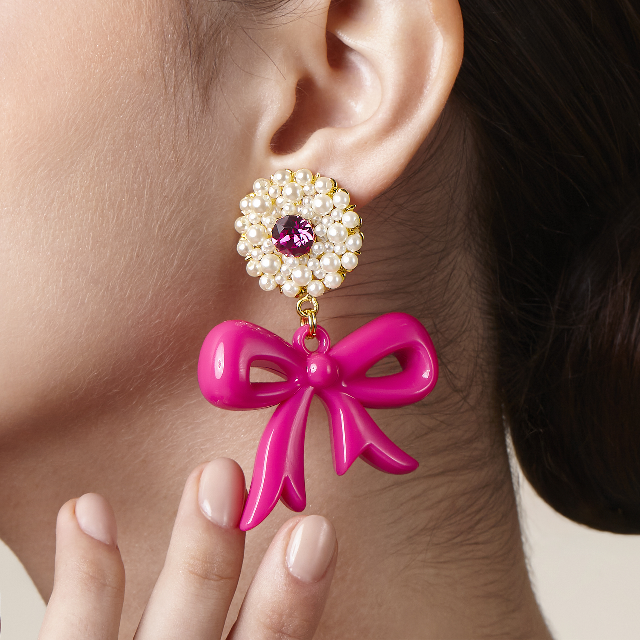 Aretes de lazos de acrílico en tono fucsia, con poste de filigrana enchapada en oro, bordado a mano con perlas y cristal Swarovski.