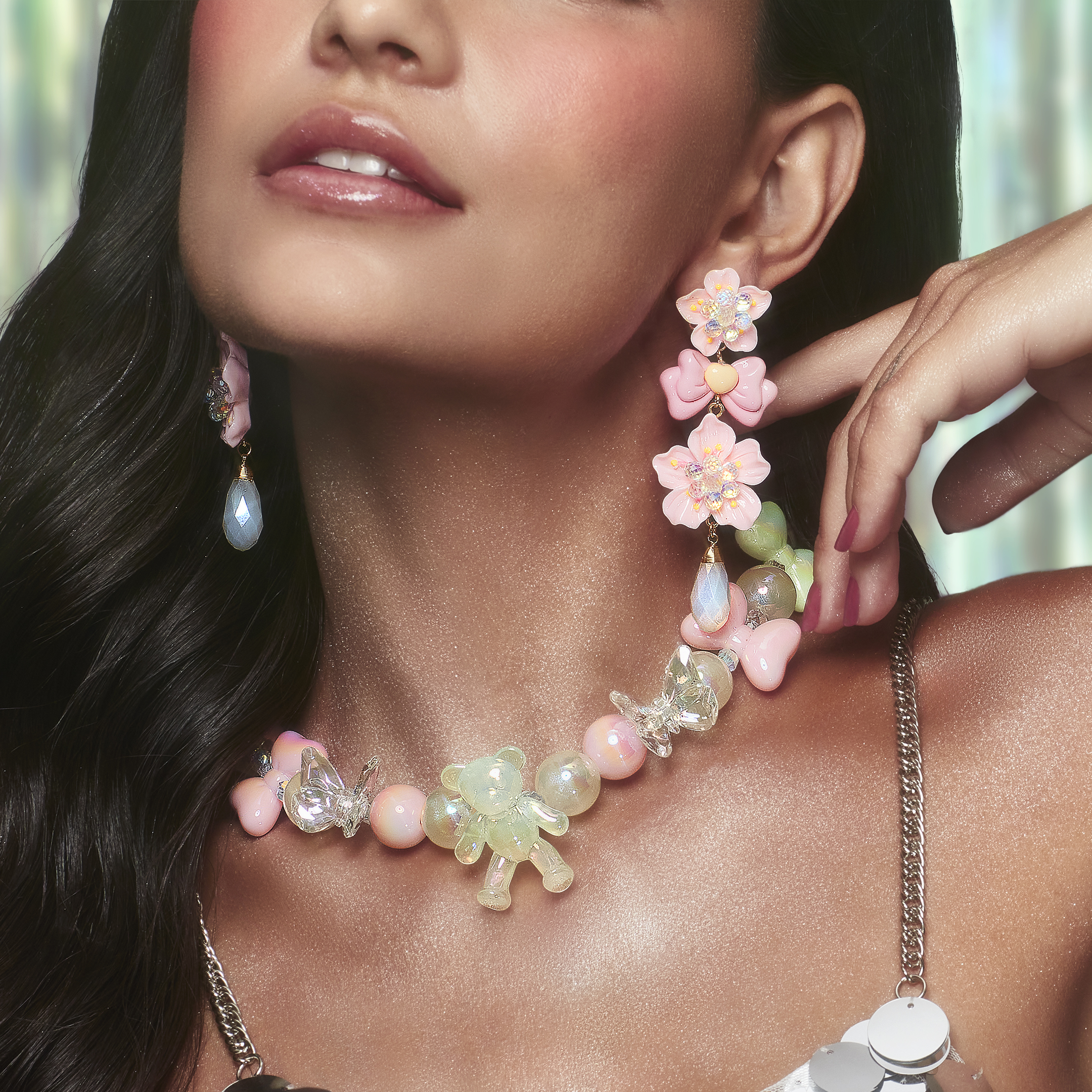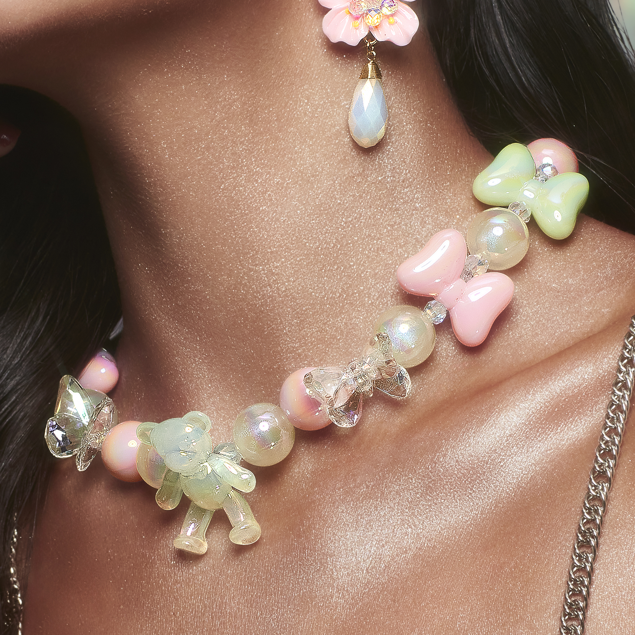 Collar de cuentas de acrílico tornasol en rosa pastel, verde menta y transparente tornasol y dije central de osito. Accesorios enchapados en oro.