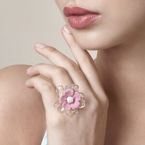 Anillo petunia bordado a mano con cuentas de cristal en forma de corazón. Realizado en base de filigrana enchapada en oro.
