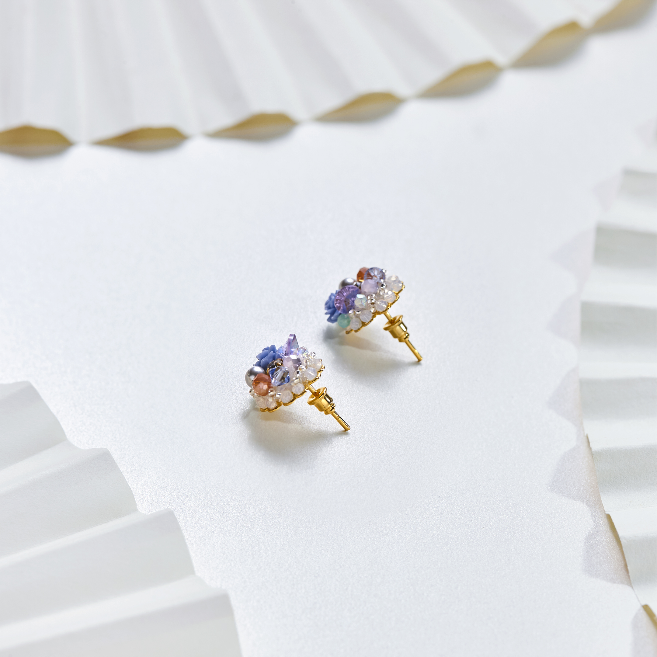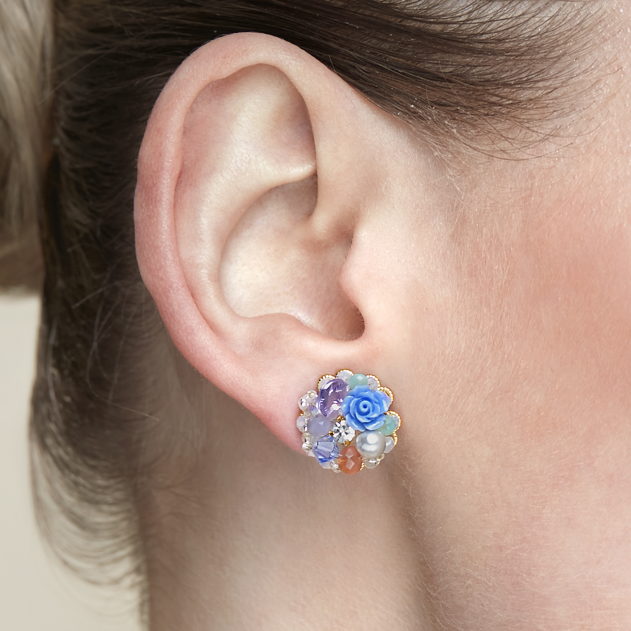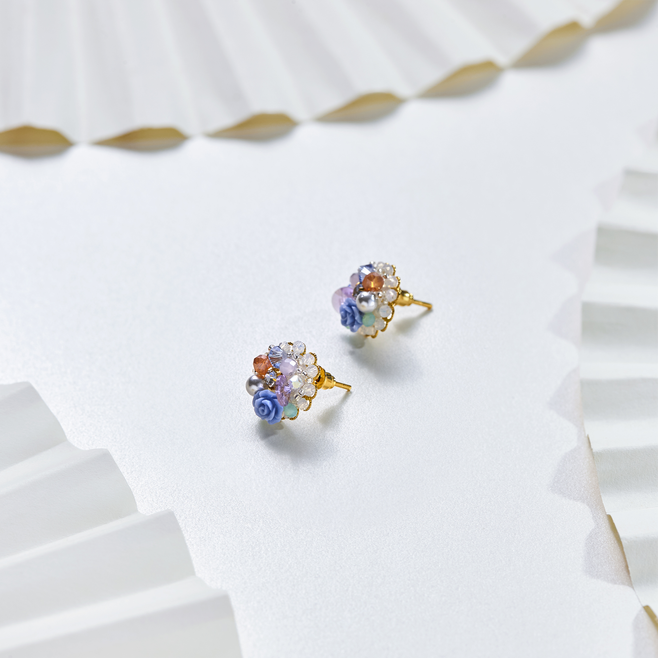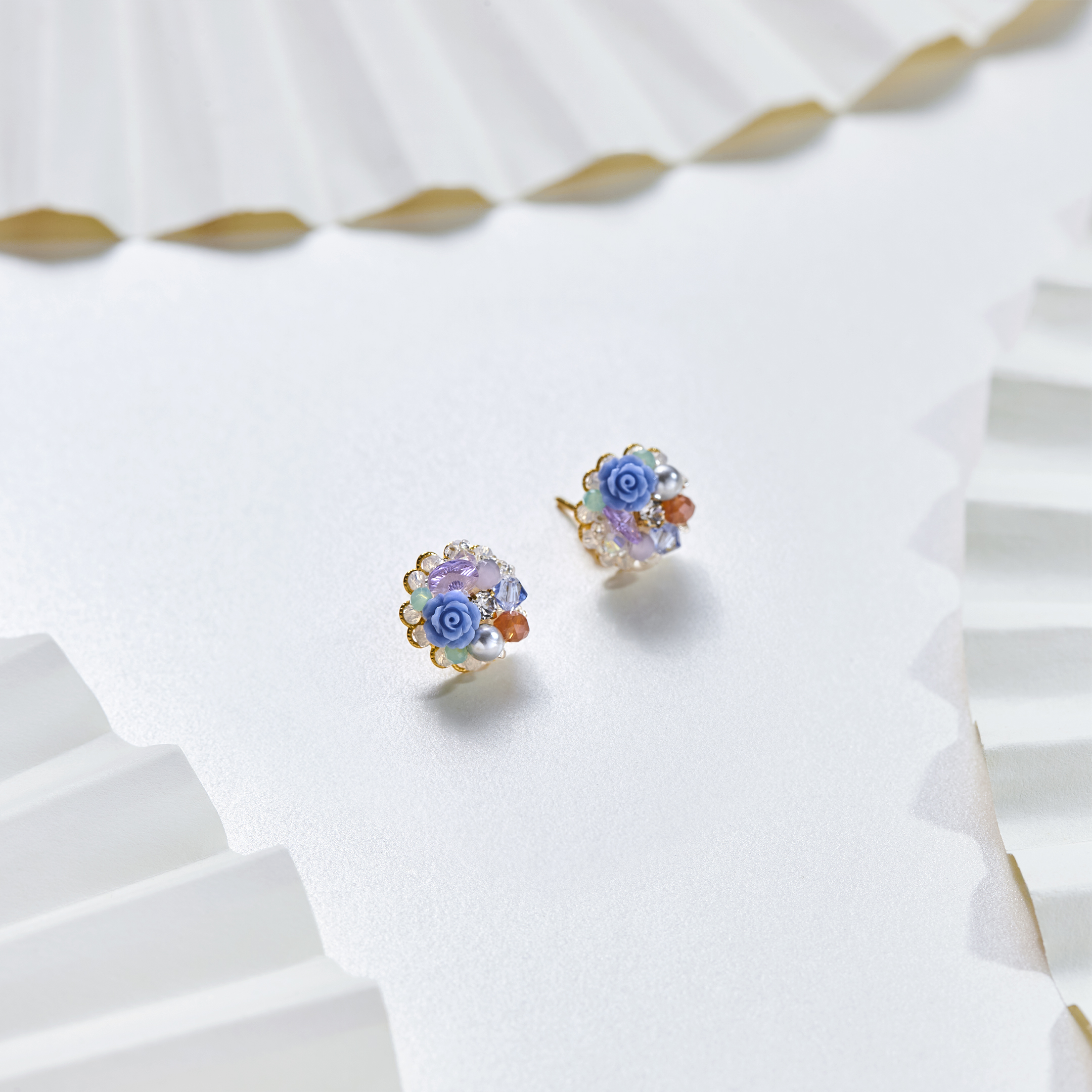 Aretes de filigrana enchapada en oro, bordados a mano con cristales Swarovski, rosas de resina, cuentas de vidrio y perlas.