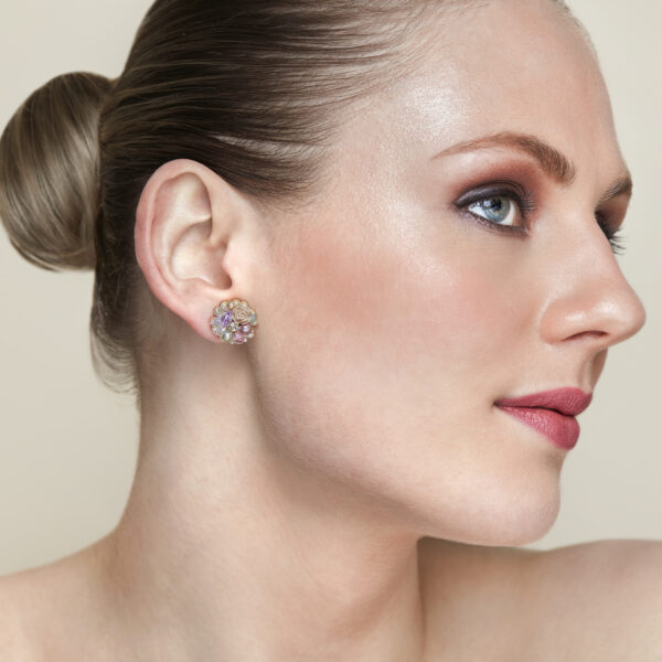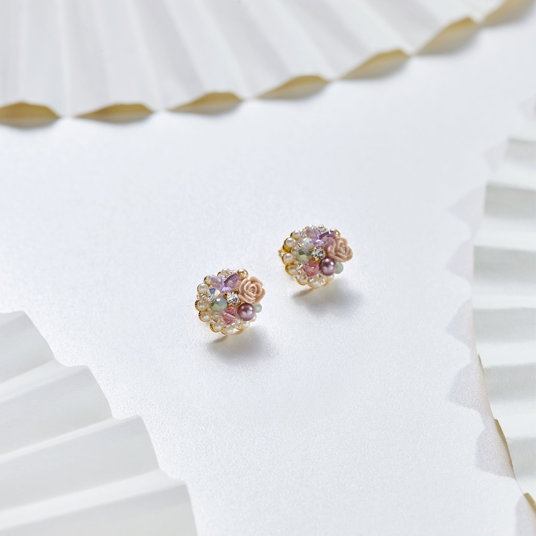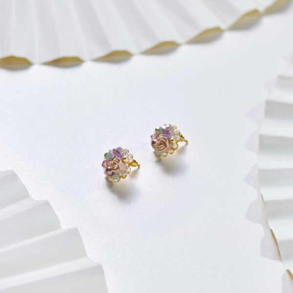 Aretes de filigrana enchapada en oro, bordados a mano con cristales Swarovski, rosas de resina, cuentas de vidrio y perlas.