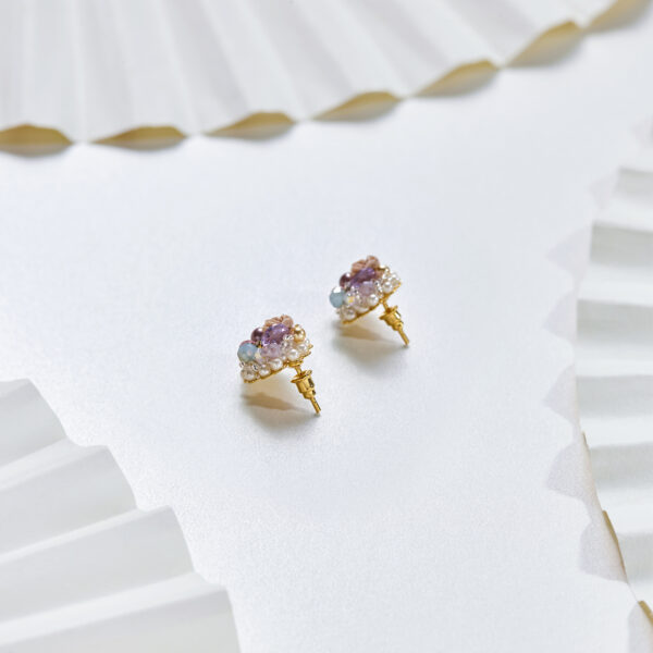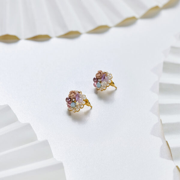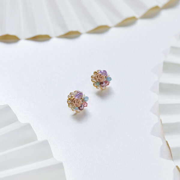 Aretes de filigrana enchapada en oro, bordados a mano con cristales Swarovski, rosas de resina, cuentas de vidrio y perlas.