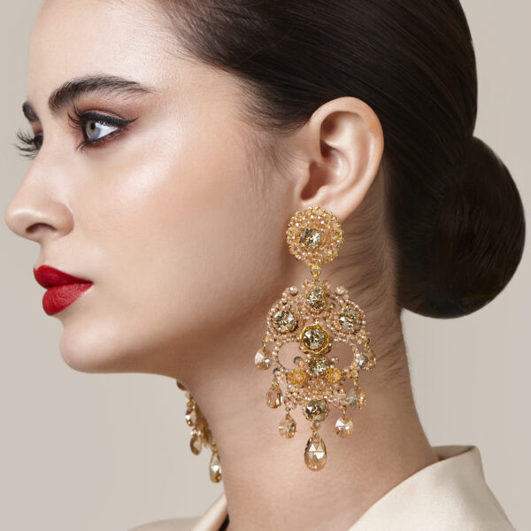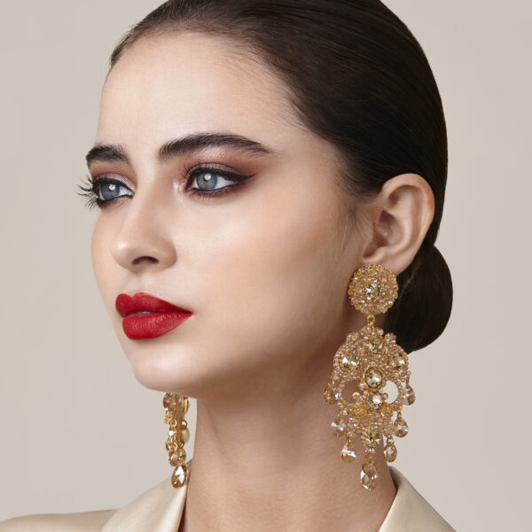 Aretes candelabros en tono champán, bordados a mano con cuentas de cristal. Colgantes y circones de cristal Swarovski.