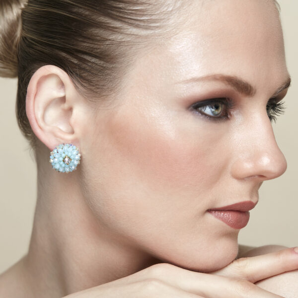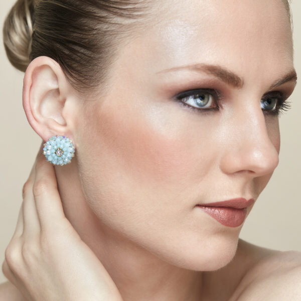 Aretes crisantemo en tono celeste pastel bordado a mano con cuentas de cristal facetado, complementos enchapados en oro de 18 kilates.