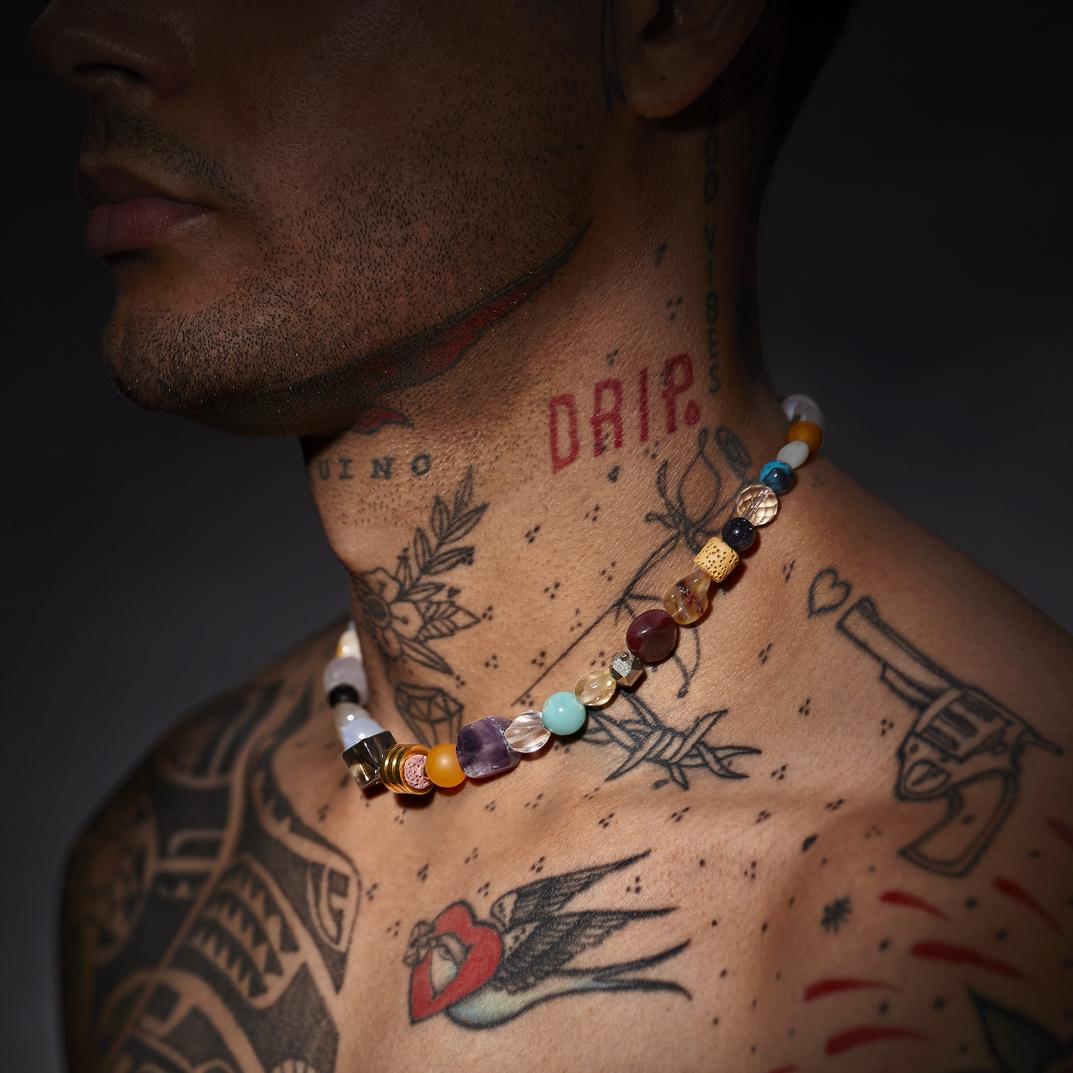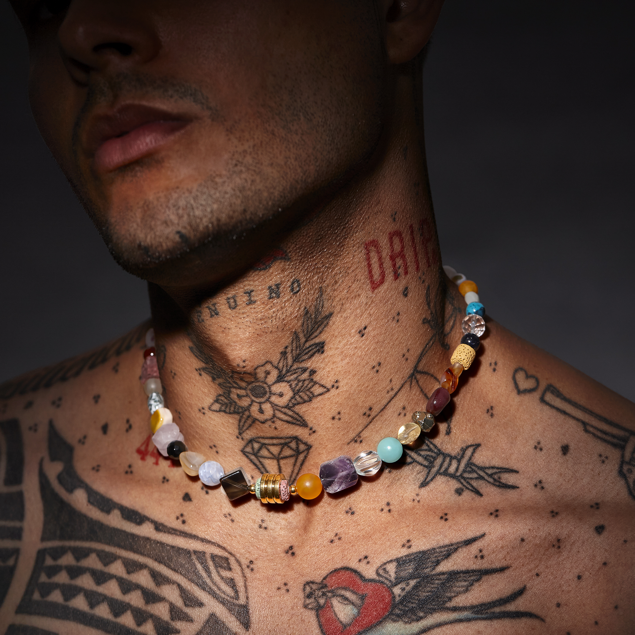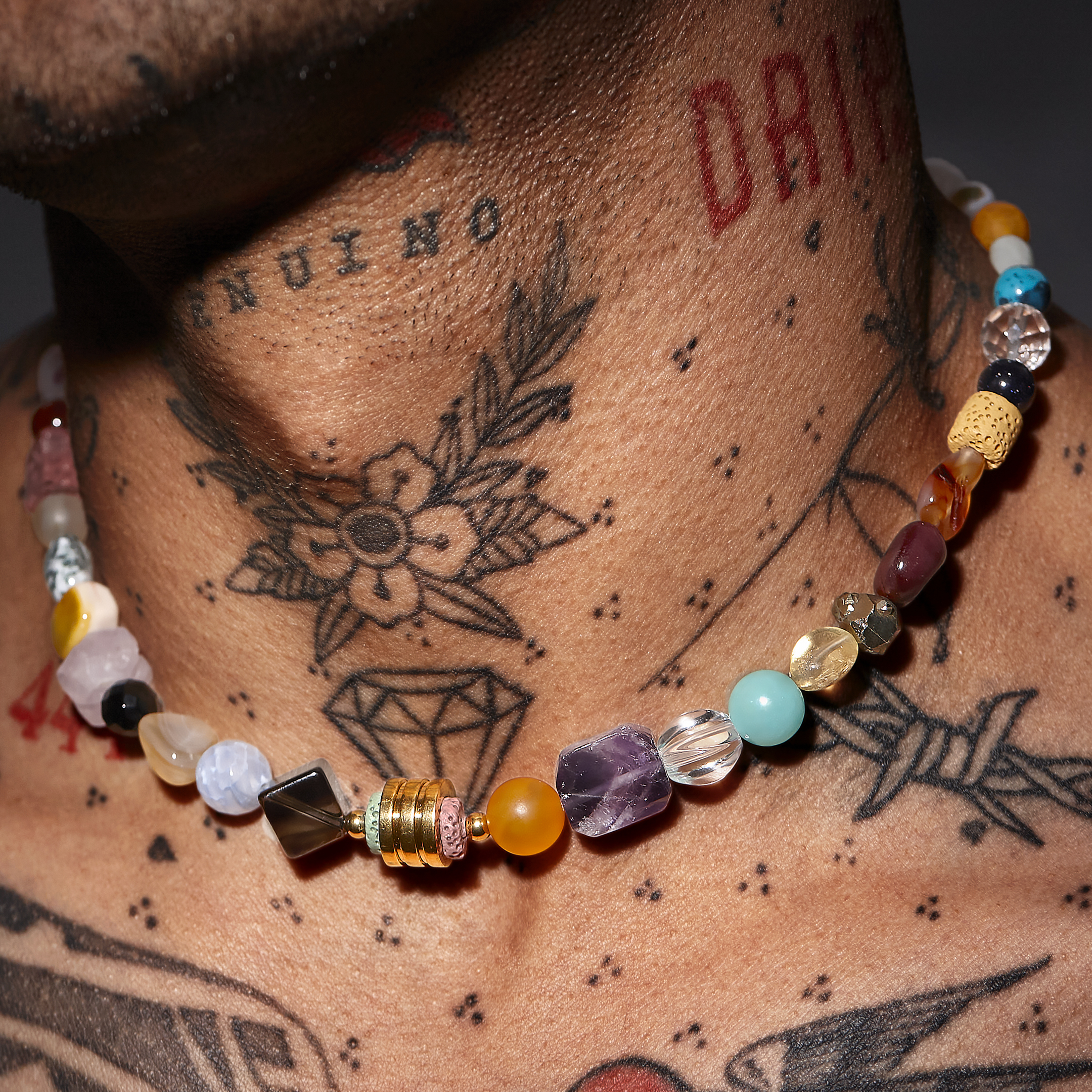 Collar estilo chaquira realizado con piedras naturales (amatista, jaspe, ágata, amazonita, cuarzo cristal, pirita, citrino, piedra volcánica, cuarzo rosa, cuarzo ahumado). Donut de acero chapado en oro.