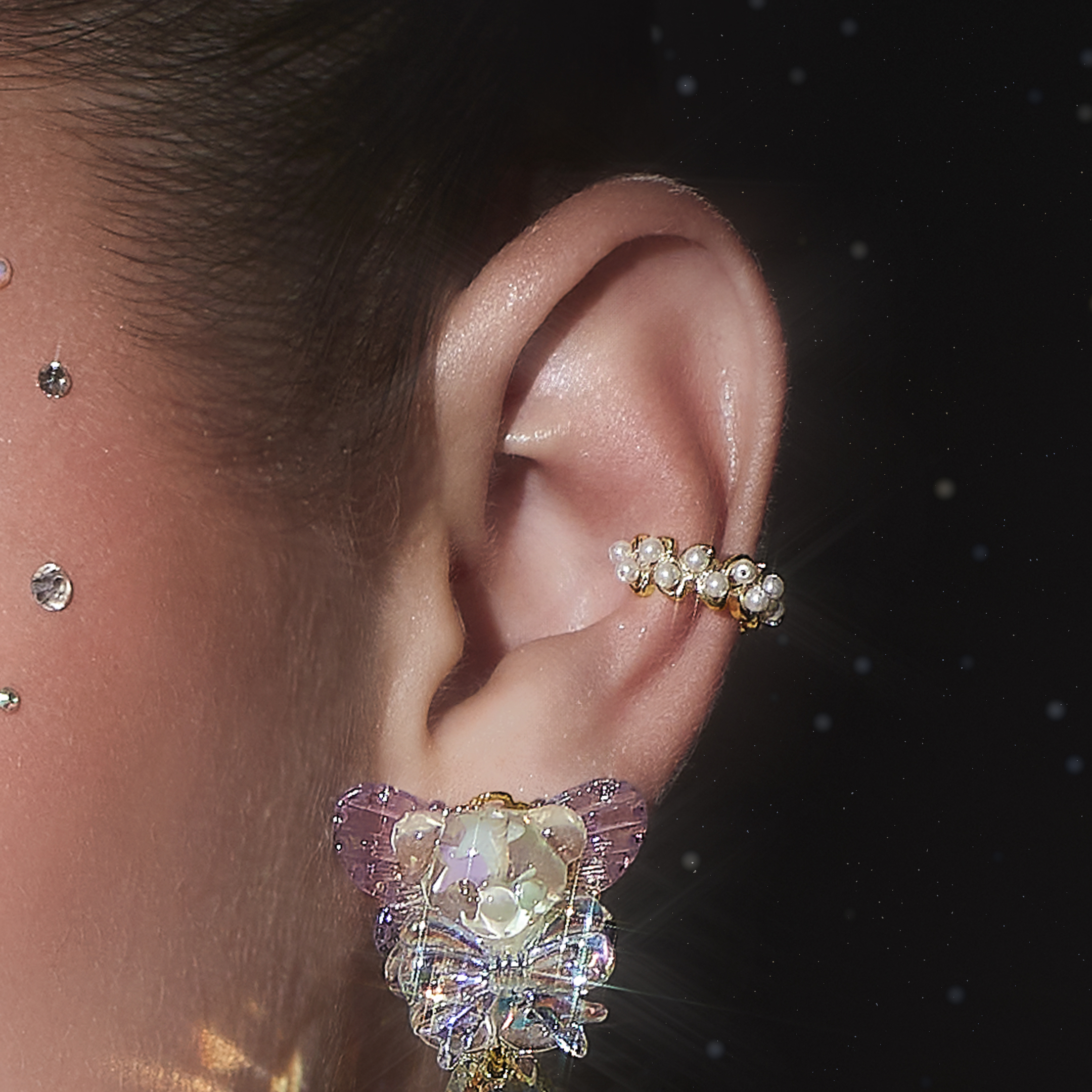 Ear cuff enchapado en oro y perlas japonesas bordadas a mano.