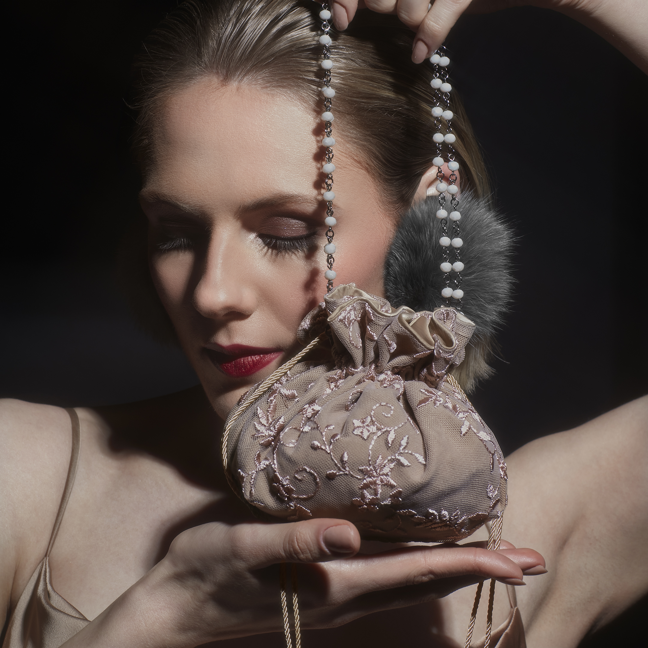 Bolso realizado en encaje y raso italiano en tono nude, asas de cuentas de cristal facetado.